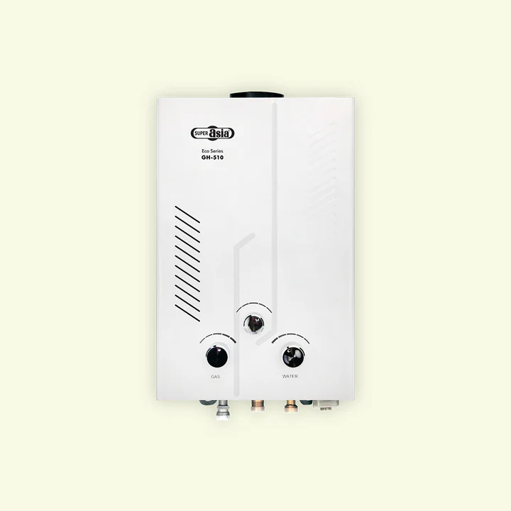 The Super Asia GH-510 Instant Geyser is a 10-liter gas water heater designed to provide instant hot water, even in low-pressure water systems. Featuring a robust and energy-efficient design, it includes a pure copper heat exchanger (on select models) for maximum heat transfer and up to 70% energy savings. The geyser is equipped with advanced safety features, including a flame failure safety device and an overheat protection system, ensuring safe and reliable operation. Its three-knob control allows precise adjustment of temperature and water flow according to weather conditions.